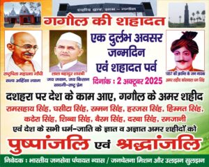 गगोल (मेरठ, उत्तर प्रदेश), 2 अक्टूबर 2025. ग्राम गगौल के लिए यह एक ऐसा दुर्लभ अवसर था। आज राष्ट्रपिता महात्मा गांधी सत्य, अहिंसा, त्याग की प्रतिमूर्ति एवं जय जवान जय किसान का नारा देने वाले प्रधानमंत्री लाल बहादुर शास्त्री की जयंती अर्थात् दो महान महापुरुषों का जन्मदिन और बुराई पर अच्छाई की जीत का प्रतीक दशहरा भी आज ही था जिस दिन 1857 की जनक्रांति में नौ अमर सपूतों के बलिदान, देशप्रेम, के लिए शहादत हुई थी।