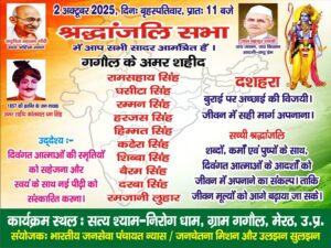 गगोल (मेरठ, उत्तर प्रदेश), 2 अक्टूबर 2025. ग्राम गगौल के लिए यह एक ऐसा दुर्लभ अवसर था। आज राष्ट्रपिता महात्मा गांधी सत्य, अहिंसा, त्याग की प्रतिमूर्ति एवं जय जवान जय किसान का नारा देने वाले प्रधानमंत्री लाल बहादुर शास्त्री की जयंती अर्थात् दो महान महापुरुषों का जन्मदिन और बुराई पर अच्छाई की जीत का प्रतीक दशहरा भी आज ही था जिस दिन 1857 की जनक्रांति में नौ अमर सपूतों के बलिदान, देशप्रेम, के लिए शहादत हुई थी।