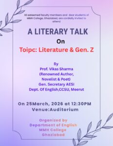 अंग्रेज़ी विभाग द्वारा साहित्य और जेन-ज़ी: समझ और चुनौतियाँ विषय पर एक महत्वपूर्ण साहित्यिक व्याख्यान का आयोजन किया गया। यह कार्यक्रम 25 मार्च 2026 को महाविद्यालय के ऑडिटोरियम में आयोजित हुआ, जिसमें प्राध्यापकगण एवं विद्यार्थियों ने उत्साहपूर्वक भाग लिया।