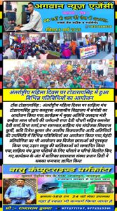 अंतर्राष्ट्रीय महिला दिवस पर साहित्य मंच टोडारायसिंह द्वारा कस्तूरबा आवासीय विद्यालय में एक संगोष्ठी का आयोजन किया गया। कार्यक्रम में मुख्य अतिथि जलदाय मंत्री कन्हैया लाल चौधरी की धर्मपत्नी राधा देवी चौधरी रही, विशिष्ट अतिथि सेवा भारती समिति महिला अध्यक्ष कमलेश देवी शर्मा, विभा शर्मा, प्रभा सारस्वत रही, साहित्य मंच संयोजक शिवराज कुर्मी, कवि दिनेश कुमार जैन व सेवा भारती समिति अध्यक्ष आशीष विजयवर्गीय ने अतिथियों का दुपट्टा व शाल ओढाकर स्वागत सत्कार किया, इस संगोष्ठी में मेहंदी प्रतियोगिता का भी आयोजन किया गया जिसमें प्रथम स्थान मैना मीना, द्वितीय स्थान सुमन मीना, तृतीय स्थान आचूकी प्रजापत बालिकाओं को पुरस्कार देकर सम्मानित किया गया, तथा उड़ान समूह की बालिकाओं को प्रेरणादायी प्रस्तुति के लिए सम्मानित किया गया, इस दौरान राधा देवी चौधरी व कमलेश शर्मा ने बालिकाओं को शिक्षा के साथ साथ खेलकूद तथा अन्य प्रेरणादायक गतिविधि में भाग लेने के लिए भी प्रेरित किया। साहित्य मंच द्वारा पक्षियों के लिए घोंसले व परिन्डे भी वितरित किए गए , बालिका छात्रावास संस्था प्रधान प्रिती ने सबका धन्यवाद ज्ञापित किया।
